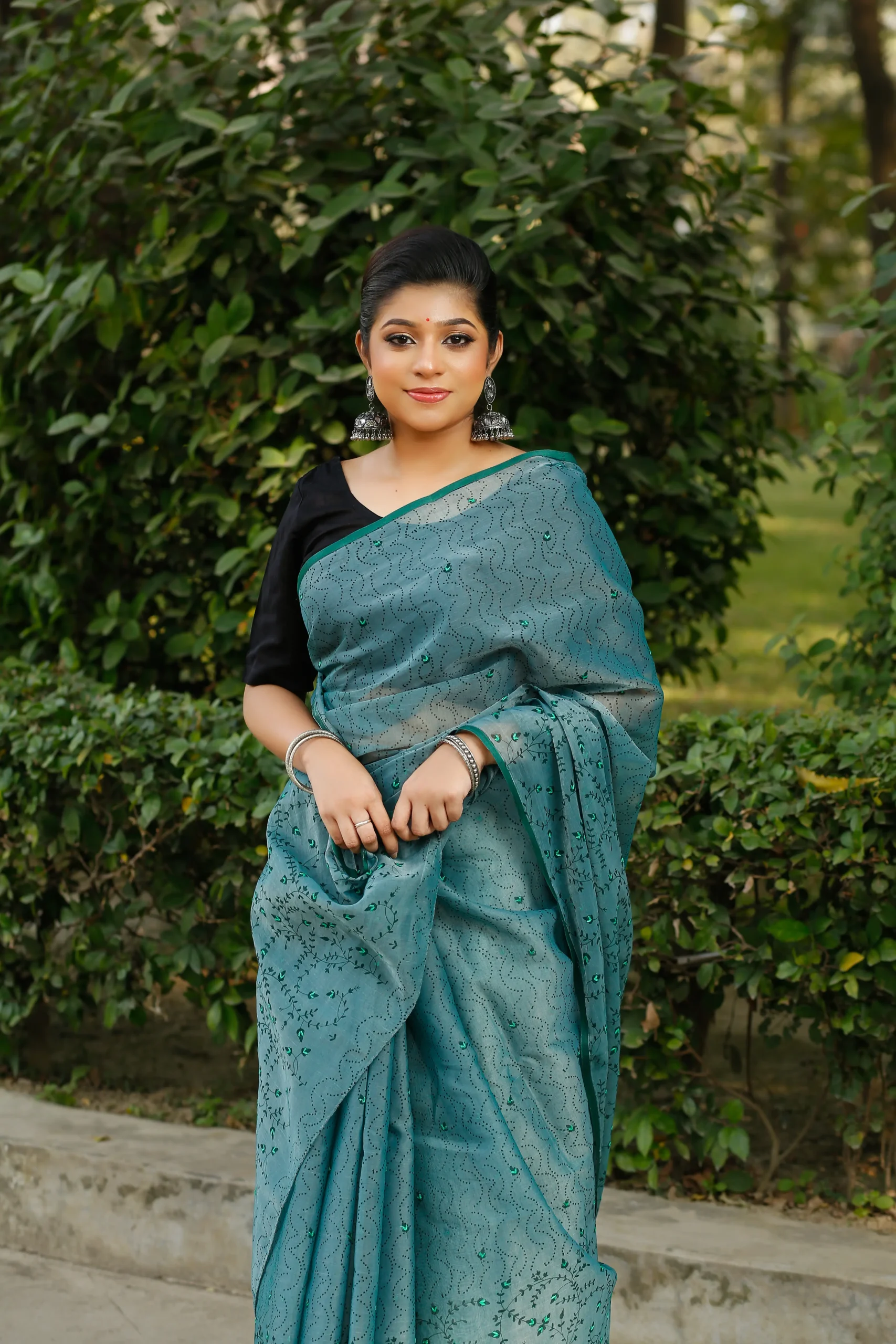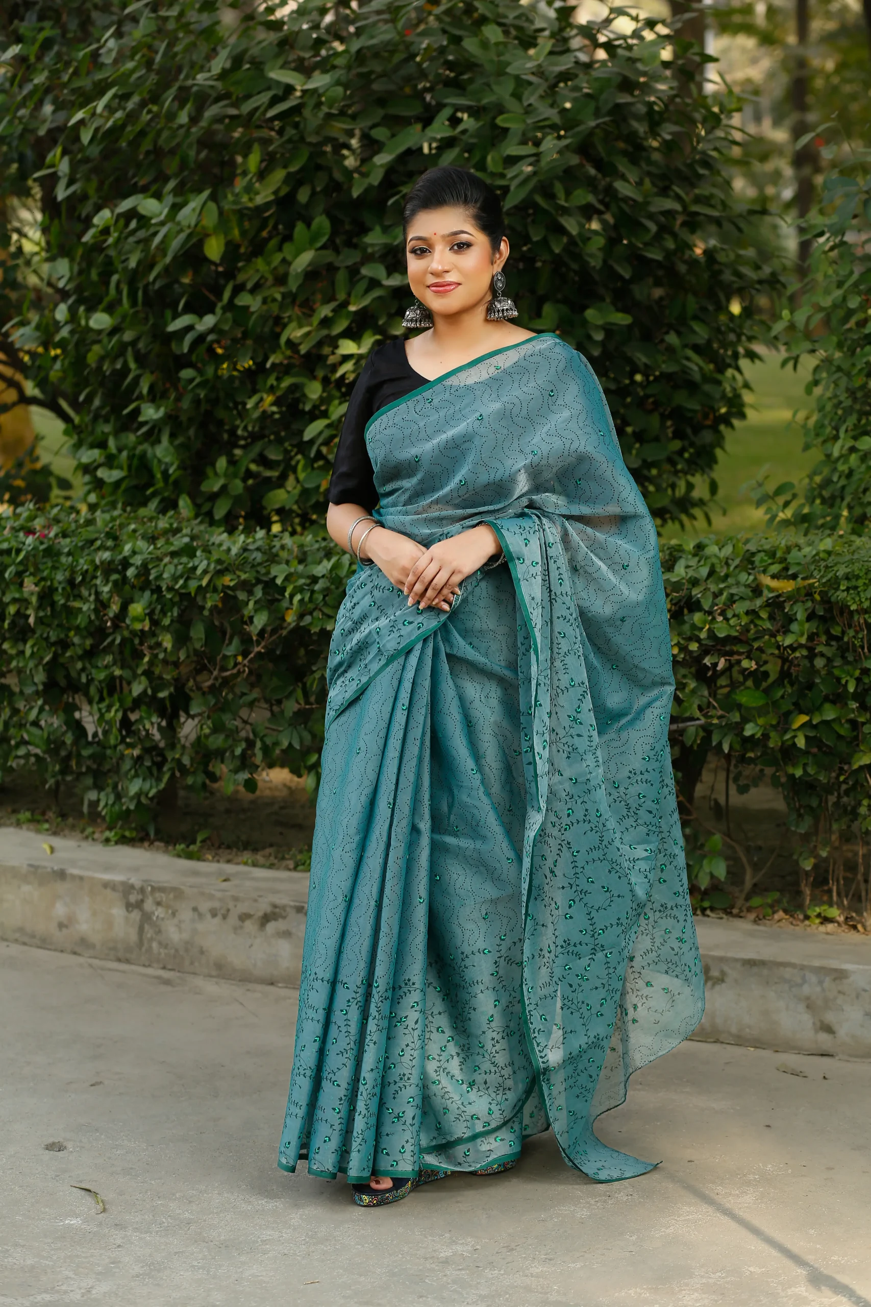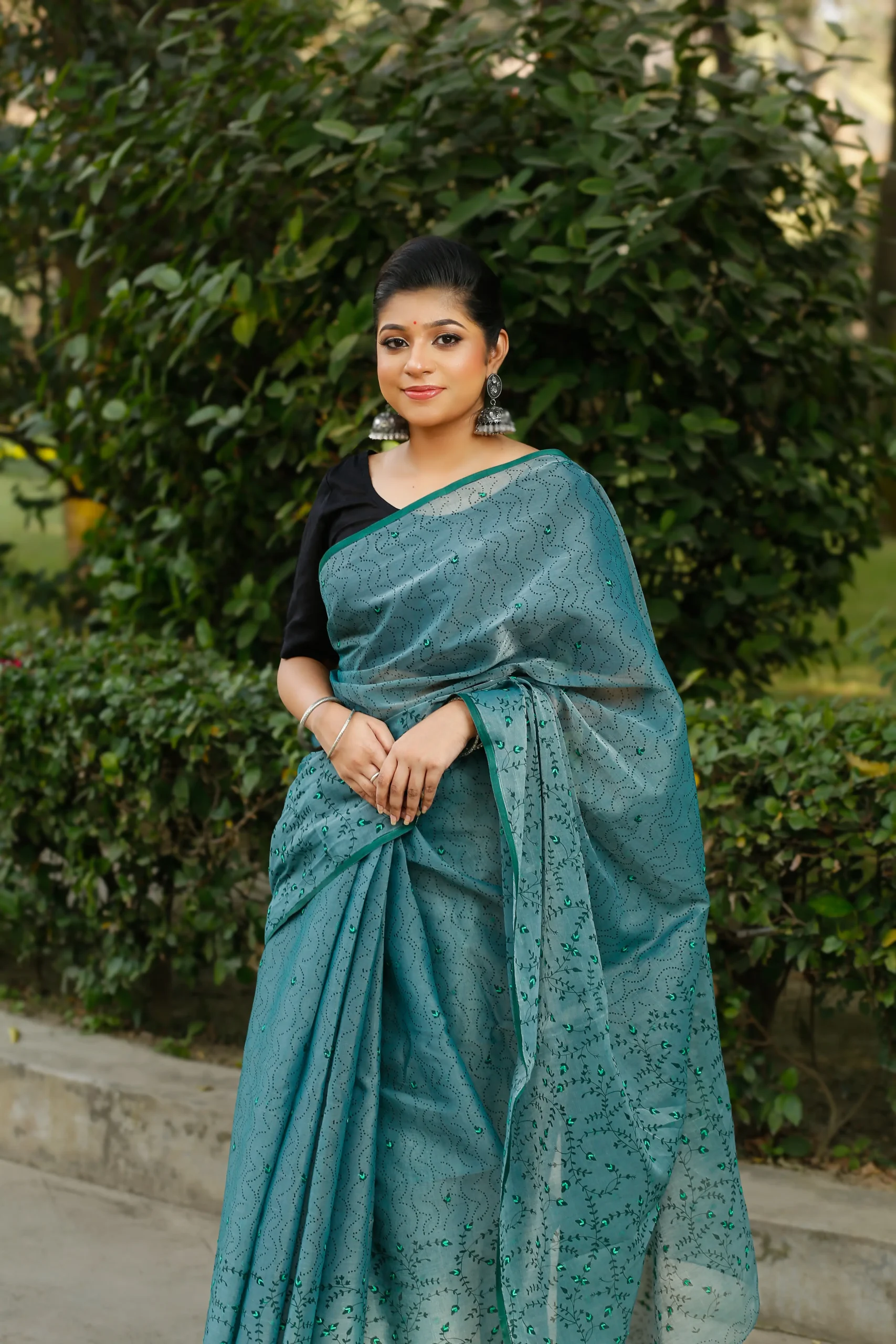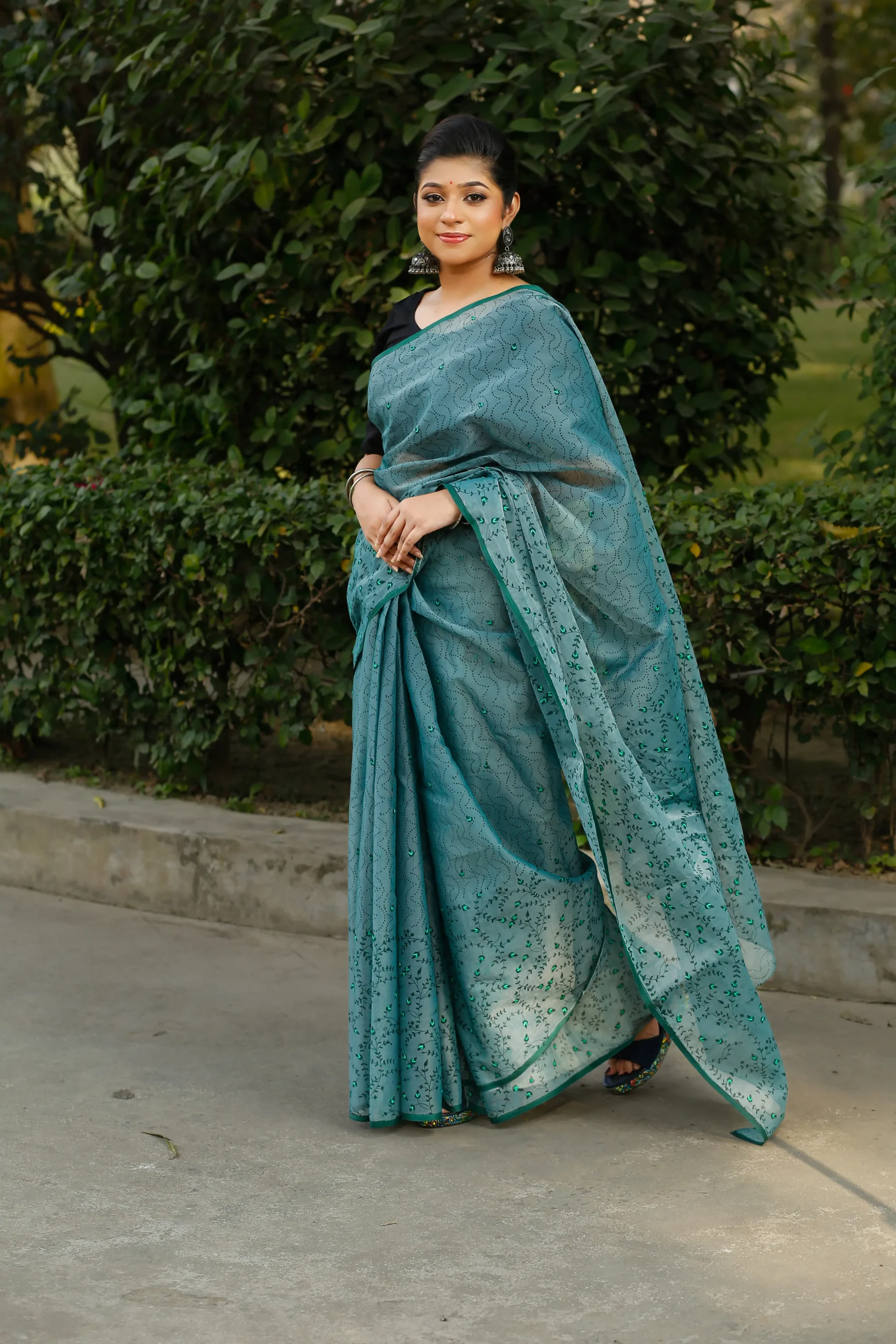 Turquoise Teal Half Silk Nakshi Applique Embroidery Saree.